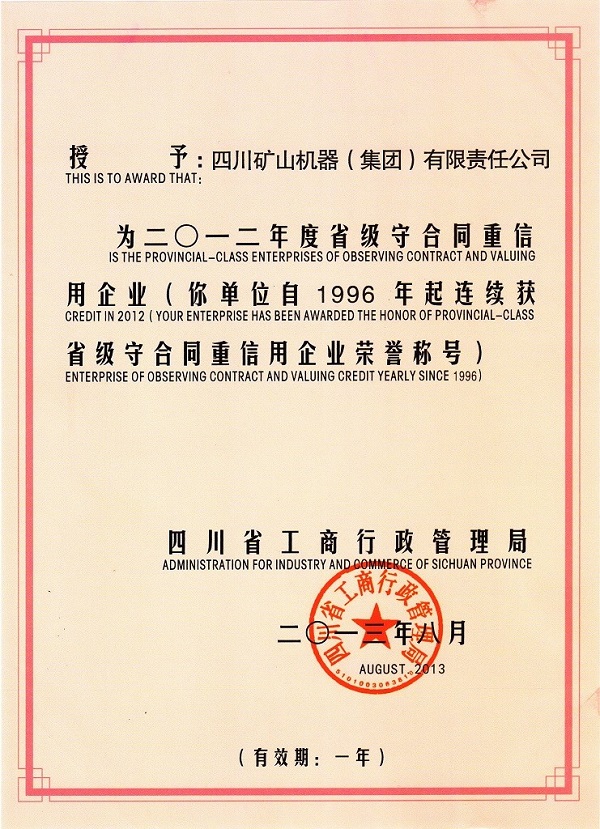 Sichuan Coal Group Inc. has, from the provincial Trade and Industry Bureau, Sichuan Mining Machinery (Group) Co., Ltd. was awarded the "provincial Credible Enterprise" (consecutive provincial Credible Honor title since 1996 ), and issued a certificate of honor.